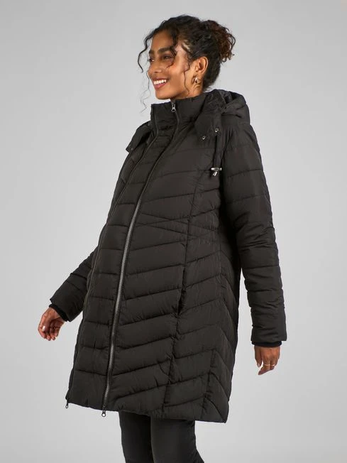 Make your budget go further with our genius black two-in-one maternity puffer coat which has been designed to be used throughout your entire pregnancy, and after the birth too. The centre panel can be inserted or removed to adjust to your changing shape, and it has a comfortable hood attached to help you stay warm and dry. Beautifully padded with a supersoft feel, it’s guaranteed to keep you cosy. Designed to fit during and after pregnancy. Removable front panel. Showerproof. Zip opening. Padded for extra warmth. Detachable hood.