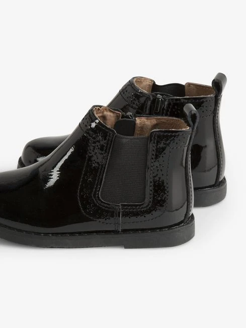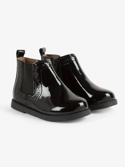 Add the perfect finishing touch to a smart casual look on chilly days with a pair of our Black Patent Pretty Leather Chelsea Boots, made from real leather for a luxurious feel. The classic style is perfectly paired with many of our dresses, skirts or cords and with soft padding, they’re really comfortable for little feet. Pretty floral brogue cut out design. Elastic side panel for easy dressing. Inner side zip opening. Extra supportive seams. Anti-sweat cotton lining.