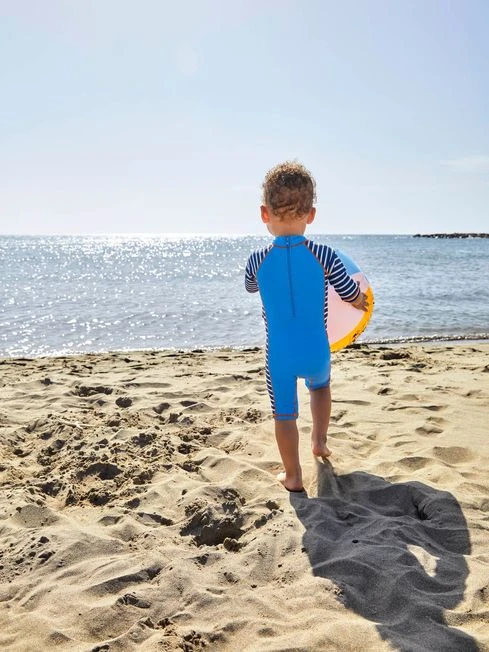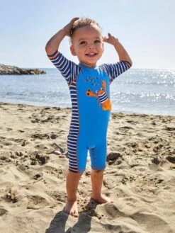 Our 1-Piece Blue UPF 50 Sun Protection Suit is an effective way to help protect children from harmful UV rays. Ideal for both playing in the sun and for swimming, it keeps covered areas safe from sunburn, enabling little ones to enjoy playing outside in the sun for longer. The lightweight, quick-drying fabric makes the sun suit even more practical, and the fun lobster design will delight kids. Plus, it has been made with recycled plastics, making it a more sustainable choice than those made with traditional materials. • Made with recycled plastics • UPF 50+ (98% effective at blocking UVA rays) • Lightweight • Quick-drying • Lobster appliqué to front • Cheerful design to make children easier to spot WARNING: Sun exposure causes skin damage. This item will only provide protection to areas directly covered and, to a lesser extent, areas shaded from the sun. Only covered areas are protected, other exposed areas of the body should be protected by a high factor sun cream. Protection offered by this item may be reduced with use, or if stretched or wet. Sun exposure causes skin damage. Young children are particularly at risk of sunburn because of their delicate skin, babies are especially vulnerable. Keep babies out of the sun. 80% Recycled Nylon 20% Elastane. • Machine Wash At 30° • Use Delicate Setting • Do Not Tumble Dry • Do Not Iron • Do Not Dry Clean