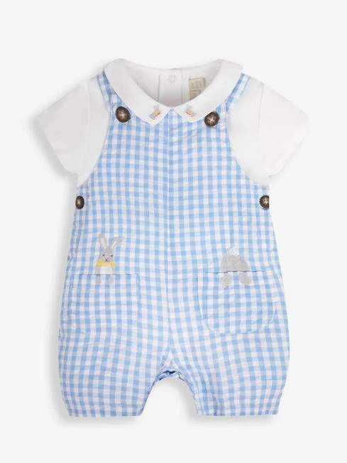 Jojo Maman Bebe JoJo Maman Bébé Blue 2-Piece Gingham Bunny Pocket Baby Short Dungarees Set