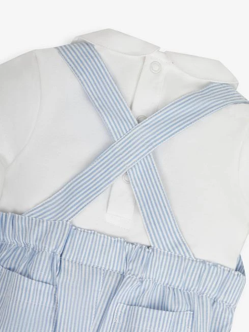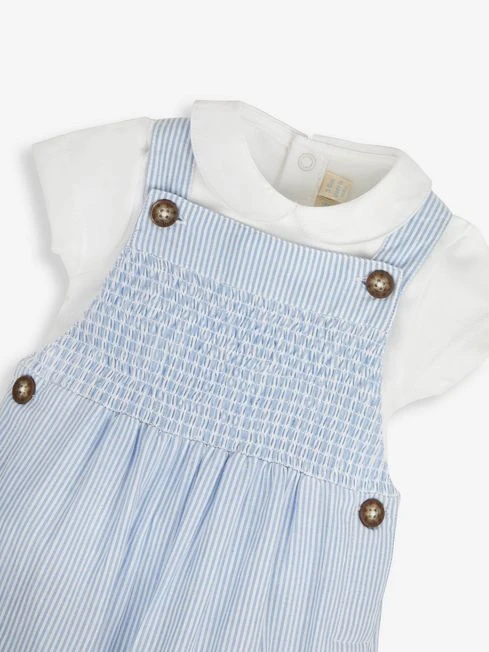 When you’re looking for a stylish outfit that keeps your baby comfortable during the day, this outfit is the perfect choice. We’ve designed our 2Piece Blue Smocked Short Dungarees & Collar Body Set to be gentle on skin and feature a classic blue stripe with smocking to the chest and gathered cuff details. This outfit is complete with a Peter Pan collar bodysuit that makes it even better value. 2piece set Includes stripe dungarees and bodysuit. Smocking to chest. Popper back opening to bodysuit for easy dressing. Bubble style bottom. Button adjustable straps.