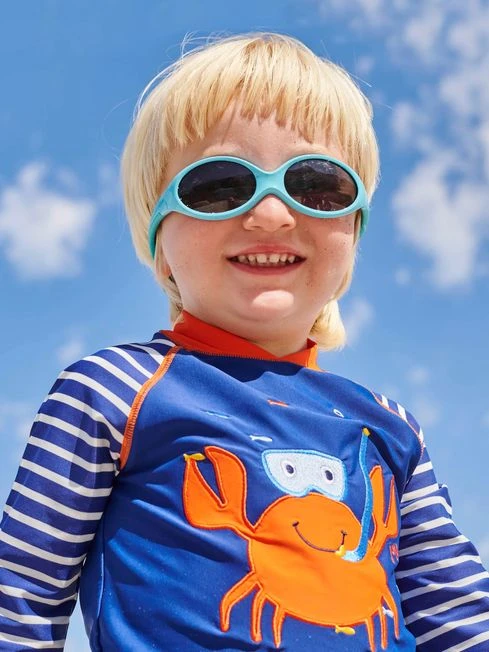 Our Crab Sun Protection Rash Vest is an effective way to help protect children from harmful UV rays. Ideal for both playing in the sun and for swimming, it keeps covered areas safe from sunburn, enabling little ones to enjoy playing outside in the sun for longer. The lightweight, quick-drying fabric makes the sun suit even more practical, and the fun crab design with contrasting striped arms will delight kids. Plus, it has been made with recycled plastics, making it a more sustainable choice than those made with traditional materials. Made with recycled plastics. UPF 50+ (98% effective at blocking UVA rays). Lightweight. Turtle appliqué to the front. Zip back opening for easy dressing. Cheerful colours make children easier to spot. Please note: appliqué stitching may vary. WARNING: Sun exposure causes skin damage. This item will only provide protection to areas directly covered and, to a lesser extent, areas shaded from the sun. Only covered areas are protected, other exposed areas of the body should be protected by a high factor sun cream. Protection offered by this item may be reduced with use, or if stretched or wet. Sun exposure causes skin damage. Young children are particularly at risk of sunburn because of their delicate skin, babies are especially vulnerable. Keep babies out of the sun.