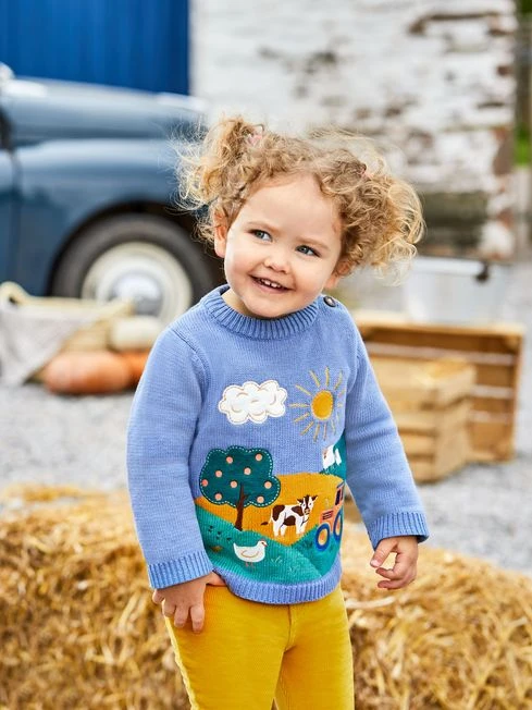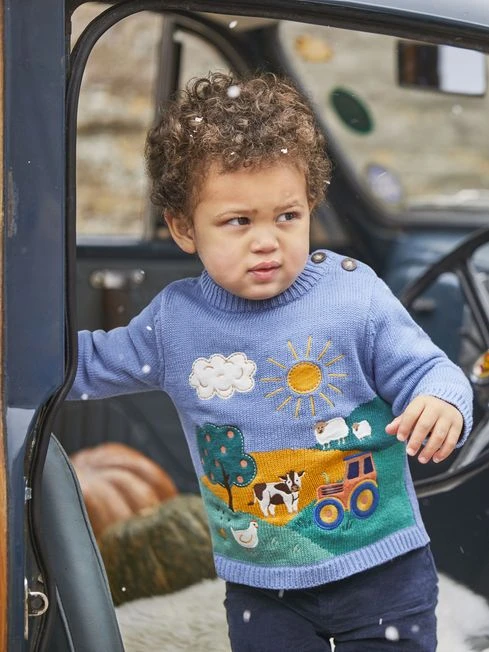 A child’s wardrobe wouldn’t be complete without a warm jumper, and this fun version offers an adorable layer to your child’s look. Made with a supersoft cashmere mix knit, the blue farm scene jumper is a lovely option for colder days. It’s machine washable, so it’s not just stylish but practical as well. Featuring cashmere mix, rocket intarsia to front, round neck, long sleeves, ribbed edges and button shoulder opening for easy dressing. Take care of your knitwear, read our wool care guide.