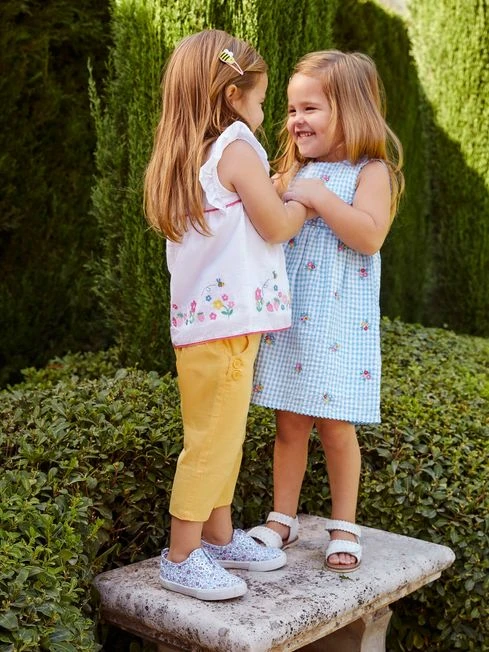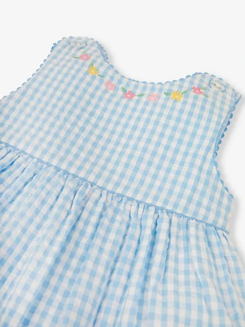Summer is here, with the Blue Gingham Strawberry Appliqué Dress s cool and classic gingham in a blue hue, adorned with fun strawberry appliqués and floral embroidery. Simply add sandals for a complete look for a fun day in the sunshine or spring party. Classic gingham. Floral & strawberry embroidery. Round neck. Ric rac trim to edges. Button shoulder opening. Gathering to empire seam. Please note appliqué stitching may vary.