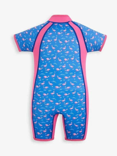 Wetsuits offer the obvious solution to cold swimming pools and less warm beaches. Neoprene provides a flexible, comfortable fit and helps keep little ones warm so they can stay in the water for longer. The front zip opening makes our child wetsuits easy to get on and off, while the surfer style ensures kids look the part! All-over flamingo print. Keeps children warmer for longer. Surfer style. Short sleeves. Zip front opening Rinse by hand in 30-degree water immediately after use and allow to dry out of sunlight to avoid discolouration.