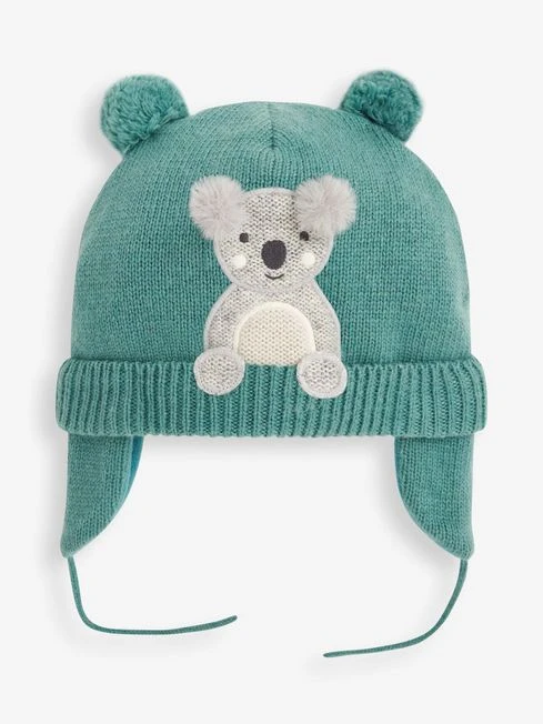 A traditional style gets a modern update thanks to adorable pom poms and koala appliqué. The Teal Koala pom pom hat is crafted from supersoft recycled fabric with a snuggly fleece lining for extra cosiness. Ears are kept extra warm by little flaps that are secured with a tie under the chin. Features soft knitted fabric, fleece lined, ties under the chin, pom poms to top, koala appliqué to front and unrestrictive, flexible fit and shaped to keep ears warm.