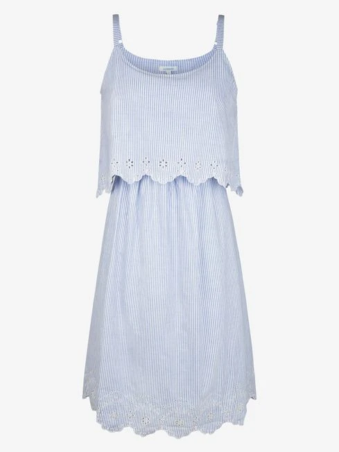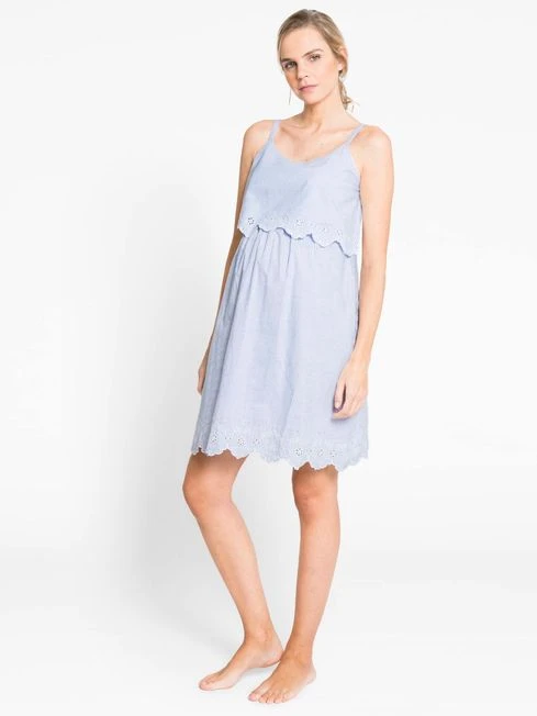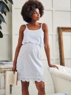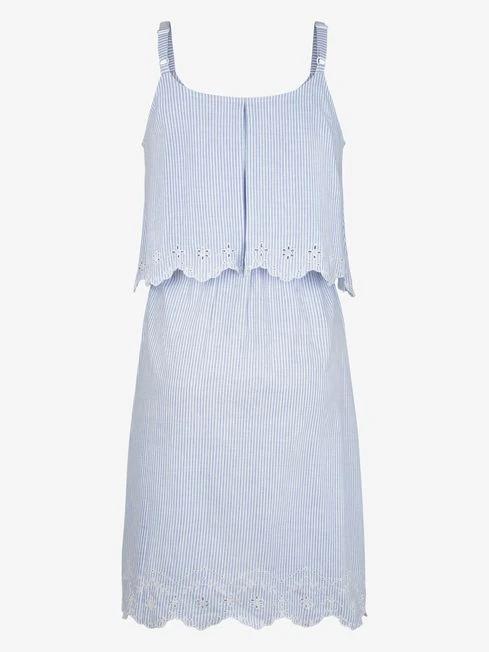 When comfort is key, opt for the Blue Ticking Stripe Maternity & Nursing Nightdress for lounging in at home. Designed to fit during and after pregnancy, the pretty embroidered detailing ensures a feminine feel while the back slit will adapt to your changing shape. Hidden feeding slits in the under layer offer easy breastfeeding access, making the piece essential for your hospital bag. Designed to fit during and after pregnancy Striped pattern Suitable for breastfeeding Feeding slits in under layer Adjustable straps Scooped neck Split at back for extra room Cutwork embroidered floral detailing at hem and top layer panel Do not dry clean.