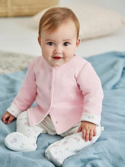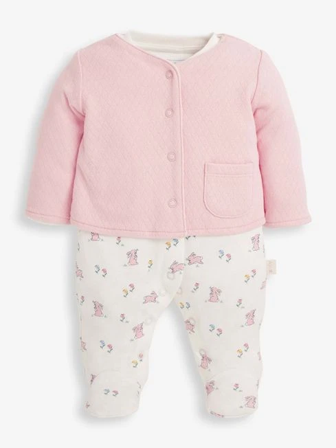 An adorable set for babies, the 2-piece bunny baby jacket & sleepsuit set features a reversible, quilted soft jacket to layer over the matching bunny print sleepsuit for an extra cosy outfit on colder days. As always, our sleepsuit has been crafted from soft cotton and features built-in scratch cuffs in smaller sizes to ensure delicate skin is always protected, 2-piece set: sleepsuit and soft quilted baby jacket, reversible jacket: one side solid pink, one side bunny print, popper front opening, popper front and leg openings for easy dressing, cosy rib neck and cuffs, fold over scratch cuffs up to size 9-12 months and sizes 9-12 months and up feature anti-slip dots on feet. KEEP AWAY FROM FIRE. Made of 100% cotton.