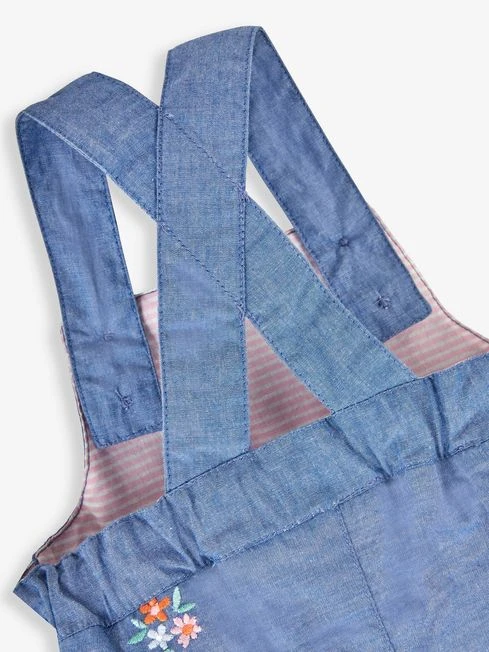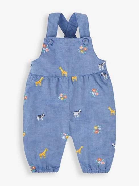 There is no doubt that dungarees are both practical and adorable, which is why they remain so popular each season. The Chambray Giraffe Embroidered Dungarees feature chambray fabric, a lighter option to denim, while the delicate giraffe and floral embroidery adds an extra touch of sweetness. Wear them on their own or over a white top on cooler days. Allover embroidery. Button adjustable straps. Cross-back. Popper crotch opening for easy changing. Contrast stripe lining”