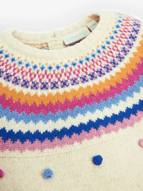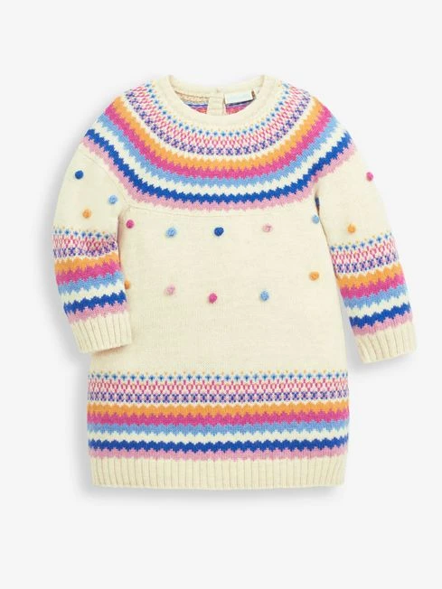 Adding a pop of colour to this classic style, our Bright Stripe Fair Isle Knitted Dress is a must-have for any winter wardrobe. The hint of cashmere in this dress gives it a luxuriously soft feel, making it an excellent choice for winter. It’s also machine washable, so it s as practical as it is cute. Cashmere mix Colourful Fair Isle design with pom poms Ribbed neck and cuffs Round neck Long sleeves Button back opening Take care of your knitwear, read our Wool Care Guide. We recommend the JoJo Knitwear Comb to tackle any bobbles.