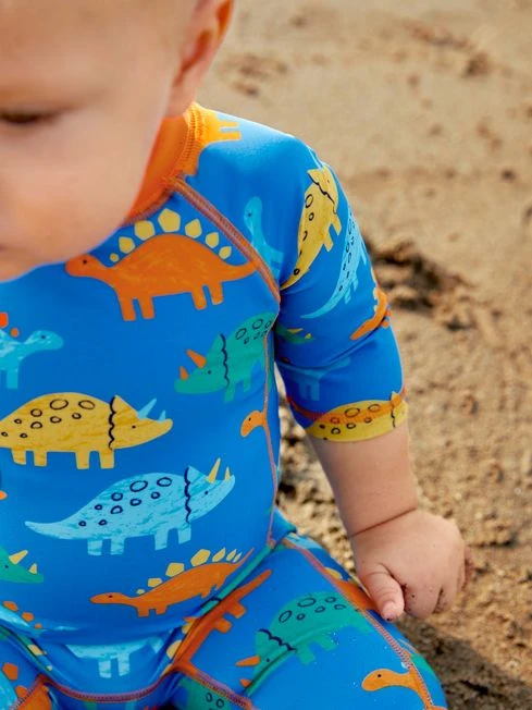 Our 1-Piece Dinosaur UPF 50 Sun Protection Suit is an effective way to help protect children from harmful UV rays. Ideal for both playing in the sun and for swimming, it keeps covered areas safe from sunburn, enabling little ones to enjoy playing outside in the sun for longer. The lightweight, quick-drying fabric makes the sun suit even more practical, and the fun dinosaur design will delight kids. Plus, it has been made with recycled plastics, making it a more sustainable choice than those made with traditional materials. Made with recycled plastics. UPF 50+ (98% effective at blocking UVA rays). Lightweight. Quick-drying. All-over dinosaur print. Cheerful design to make children easier to spot. WARNING: Sun exposure causes skin damage. This item will only provide protection to areas directly covered and, to a lesser extent, areas shaded from the sun. Only covered areas are protected, other exposed areas of the body should be protected by a high-factor sun cream. The protection offered by this item may be reduced with use, or if stretched or wet. Sun exposure causes skin damage. Young children are particularly at risk of sunburn because of their delicate skin, babies are especially vulnerable. Keep babies out of the sun.