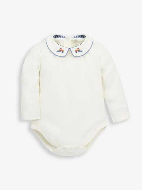 We’ve always found that collar bodysuits are a popular style, offering a smarter alternative to a regular top. Featuring adorable tractor embroidery on the collar of this baby bodysuit, it gives a nod to the outdoors for a sweet farm-themed look. It can be layered under dungarees or tucked into leggings, shorts, and trousers for crawler babies. Designed with a collar with tractor embroidery, popper back opening for easy dressing, popper back opening for easy dressing, and short sleeves. Our bodysuits are cut looser than the type worn as underwear – designed as practical tops that stay tucked in, and keep nappies covered and tights held up!
