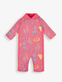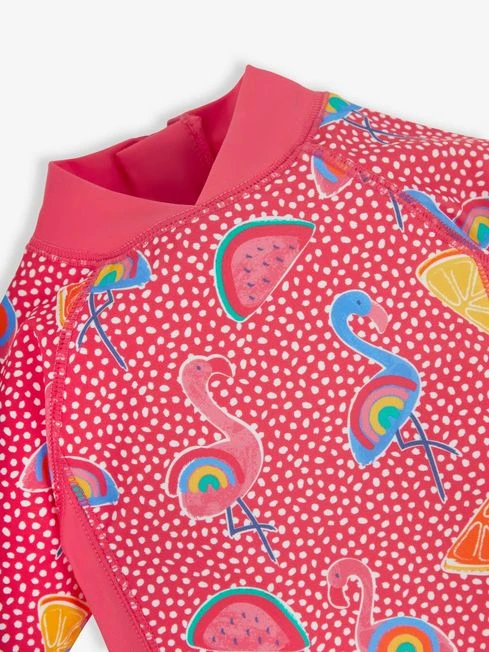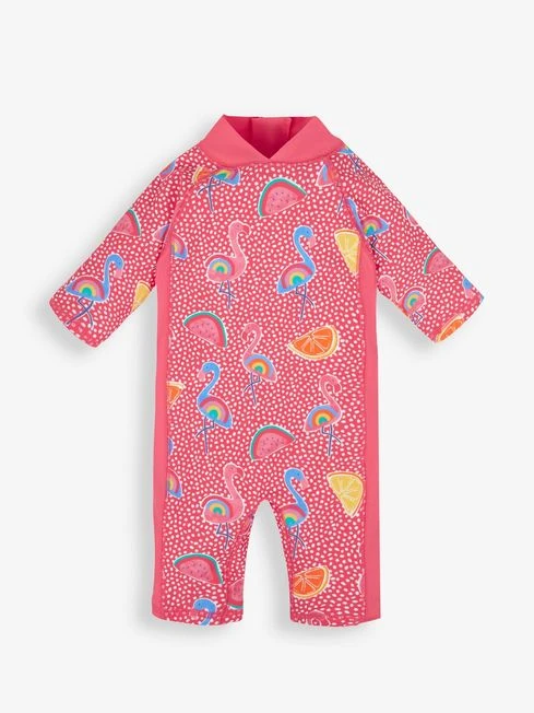 Our 1-Piece Flamingo UPF 50 Sun Protection Suit is an effective way to help protect children from harmful UV rays. Ideal for both playing in the sun and for swimming, it keeps covered areas safe from sunburn, enabling little ones to enjoy playing outside in the sun for longer. The lightweight, quick-drying fabric makes the sun suit even more practical, and the fun flamingo and fruit design will delight kids. Plus, it has been made with recycled plastics, making it a more sustainable choice than those made with traditional materials. Made with recycled plastics. UPF 50+ (98% effective at blocking UVA rays). Lightweight. Quick-drying. All-over flamingo print. Cheerful design to make children easier to spot. WARNING: Sun exposure causes skin damage. This item will only provide protection to areas directly covered and, to a lesser extent, areas shaded from the sun. Only covered areas are protected, other exposed areas of the body should be protected by a high-factor sun cream. The protection offered by this item may be reduced with use, or if stretched or wet. Sun exposure causes skin damage. Young children are particularly at risk of sunburn because of their delicate skin, babies are especially vulnerable. Keep babies out of the sun.
