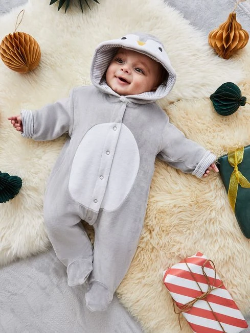 Take your precious new bundle home in ultimate comfort and cosiness. The grey penguin baby pram suit is the perfect snuggly layer to help shield your baby from the cold and features adorable penguin face detailing on the hood. It’s lined in soft cotton that s been designed to be gentle on delicate newborn skin. Features snug velour outer and soft cotton lining, cosy faux fur outer, penguin face embroidery to the hood, popper front opening for easy dressing, and front panel lined in cotton to avoid irritating sensitive skin. 80% Cotton, 20% Polyester. Machine wash at 40°. Use a delicate setting. Tumble dry on low. Cool iron on reverse. Do not dry clean.