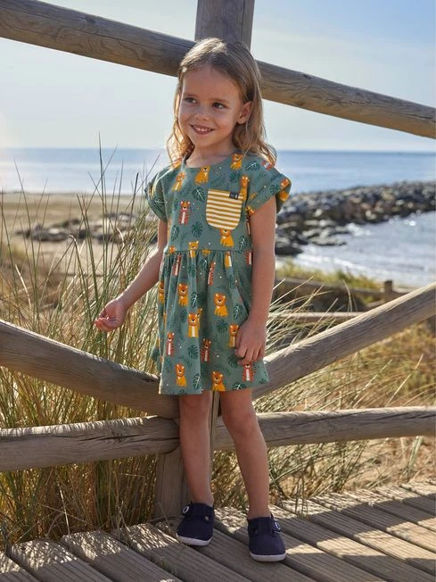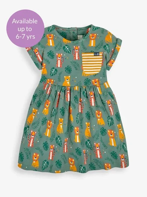 A smart casual look is easy to achieve with this Khaki Big Cats Print Drop Shoulder Dress. Featuring a colourful lion and tiger print, tropical leaves, and a contrast striped pocket, this dress is sure to make their day. Available in soft and comfortable cotton, it is the perfect summer dress for kids. All-over big cat print. Pocket to front. Round neck. Gathers at the waist. Button back opening for easy dressing.