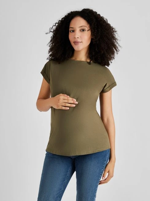 You can never have too many basic tees in your wardrobe. When maximum comfort is called for, the Khaki Boyfriend Maternity T-Shirt will be your best option. Cut to fit throughout your pregnancy, it gives you plenty of growing room at every stage. Whether you layer it under dungarees, team it with your comfiest pair of trousers or your favourite skinny jeans or shorts, it helps provide the perfect base for countless outfits. We’re proud to invest in making cotton production more sustainable; find out more here. Designed to fit throughout pregnancy Cool and comfy cotton Round neck Short grownon sleeves with turnback cuffs Do not dry clean.