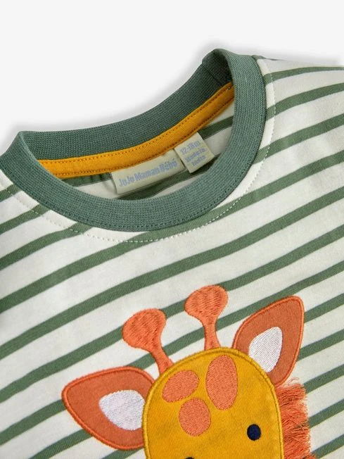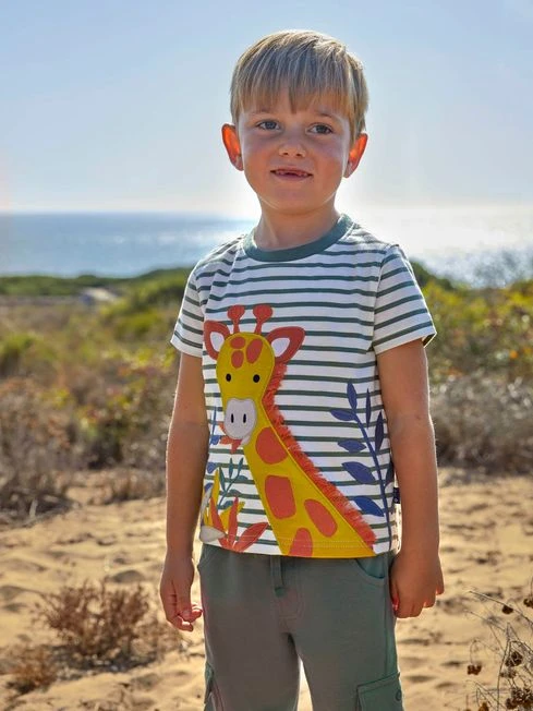 You’ll love the Khaki & Ecru Stripe Giraffe Appliqué T-Shirt for your little one this season. With an appliqué giraffe eating tasty leaves, on a sweet striped backdrop, this shirt is sure to be a hit with kids and parents alike. Almost every detail has been thought of, including the cotton lining so that the stitching won’t irritate sensitive skin. Giraffe appliqué to front. All-over stripe. Short sleeves. Round neck. Front panel lined in cotton to avoid irritating sensitive skin. Please note that appliqué stitching may vary.