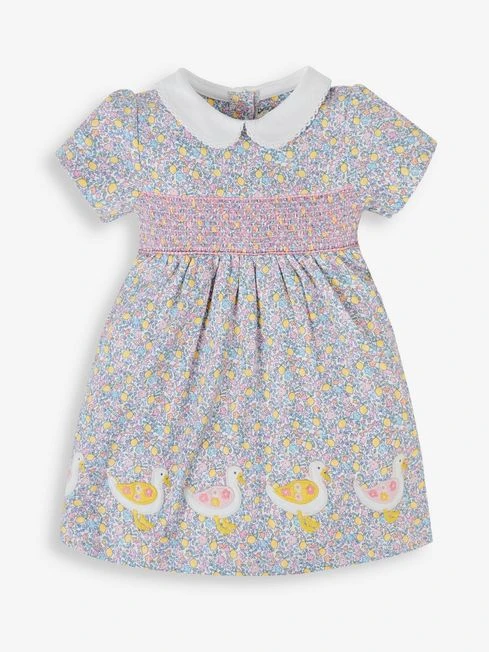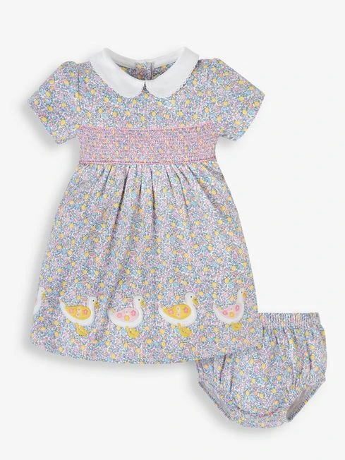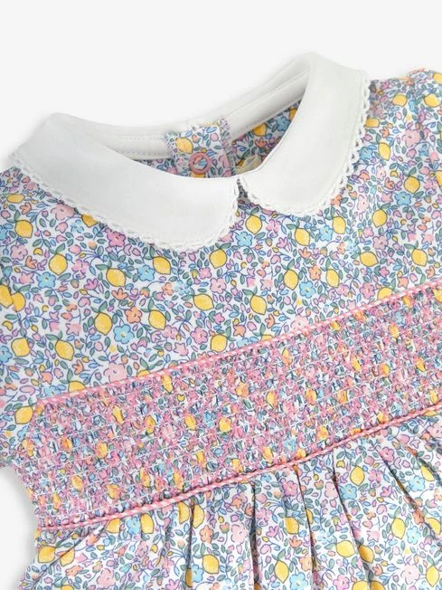 A gorgeous smocked dress will make your little one look her best at every special event this season. In soft, comfortable cotton, it features smocking to the chest and a beautiful duck appliqué on the hem. It’s finished with a sweet Peter Pan collar that’s adorable on all little ones. We love the light cotton fabric for its cooling properties – perfect for hot weather. All-over lemon ditsy print. Smocked detailing with embroidery on the chest. Peter Pan collar with picot trim. Gathers at waist. Cap sleeves. Button back opening for easy dressing. Sizes up to and including 2-3 years come with matching knickers to use as a nappy cover. Please note that appliqué stitching may vary.