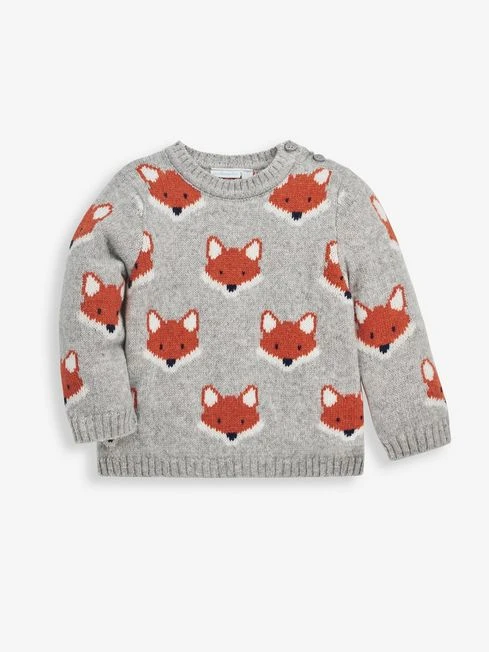 This knitted marl grey fox jumper will make an adorable addition to a youngster s wardrobe. This jumper adds a layer of warmth without being bulky and can be styled in numerous ways to make it a staple. With a side neck opening, dressing is easy for little ones, encouraging them to do it themselves. Featuring a lambswool mix, an all-over fox design, a round neck and long sleeves. Take care of your knitwear, read our wool care guide. We recommend the JoJo knitwear comb to tackle any bobbles.