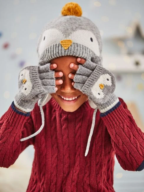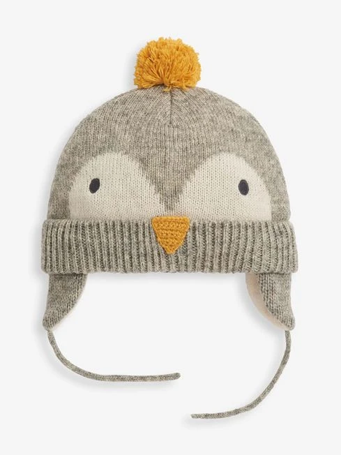 A traditional style gets a modern update thanks to an adorable pom pom and penguin face detail. The Grey Penguin Pom Pom Hat is crafted from a supersoft wool mix knit with a snuggly fleece lining for extra cosiness. Ears are kept extra warm by little flaps that are secured with a tie under the chin. Soft wool blend. Penguin face detail. Fleece lined. Ties under chin. Pom pom to top. Unrestrictive, flexible fit. Shaped to keep ears warm with contrast flaps 70% Acrylic, 30% Wool. Machine wash at 30°. Use delicate setting. Do not tumble dry. Cool iron. Do not dry clean.