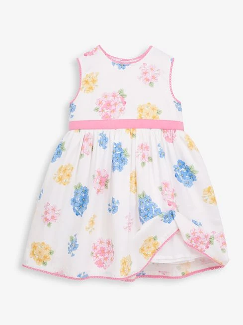 Choose the beautiful Hydrangea Party Dress for any fancy party, wedding or family get-together this season. Gorgeous details such as the pastel floral print, contrast waist band and pretty picot trim give the dress an extra pretty feel – little ones will need no encouragement to pop it on for twirling. All-over hydrangea print. Picot trim to neckline and sleeves. Contrast waist band. Sleeveless. Round neck. Button back opening for easy dressing. Gathering to the waist for a full skirt effect. 100% Cotton. Machine wash at 40°. Use delicate setting. Tumble dry on low. Cool iron on reverse. Do not dry clean.