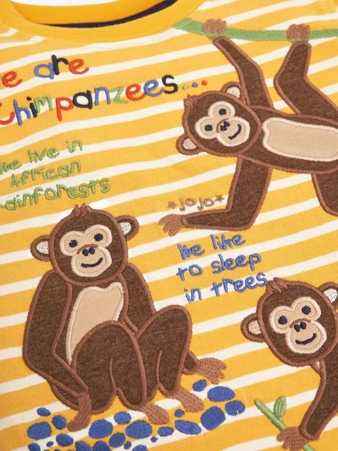 There s lots to chat about on our Mustard Chimpanzee Appliqué T-Shirt, which is sure to delight your inquisitive child. A series of cute chimps are hanging out on a backdrop of stripes, with embroidered fun facts for your little one to discover. We’ve thought of all the little details, even down to the cotton lining to prevent stitching from irritating delicate skin. Chimpanzee appliqués to front. Embroidered facts. Short sleeves. Round neck. Front panel lined in cotton to avoid irritating sensitive skin Please note appliqué stitching may vary 100% Cotton. Machine wash at 40°. Use delicate setting. Tumble dry on low. Warm iron on reverse. Do not dry clean.