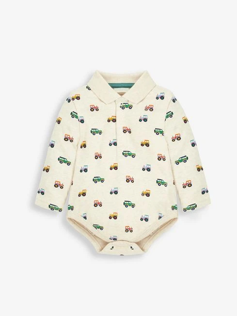 Our Oatmeal Tractor Print Polo Shirt Baby Bodysuit offers a smarter look when dressing your little one, making it ideal for layering under dungarees or teaming with leggings or trousers. The colourful tractor print is sure to brighten up your day, while soft and breathable cotton keeps babies comfy all day long. All-over tractor print. Classic polo shirt style. Half placket button front. Popper crotch opening for easy changing. Long sleeves Our bodysuits are cut looser than the type worn as underwear – designed as practical tops that stay tucked in, keep nappies covered and tights held up!