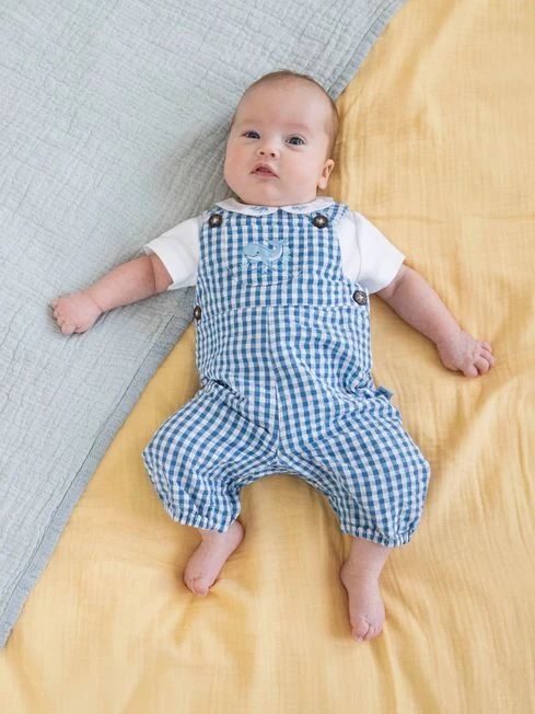 If you’re looking for a smart outfit for your baby that will keep them comfy all day long too, look no further. Our 2-Piece Navy Gingham Whale Embroidered Dungarees & Collar Body Set in cotton have been designed to be gentle on sensitive skin and feature lots of practical details that make getting dressed and nappy changing easy. Available in classic gingham and featuring sweet embroidered details, this is the perfect outfit for summer occasions. 2-piece set. Includes gingham dungarees and bodysuit. Collar with whale embroidery. Pocket with whale embroidery on front. Popper back opening to bodysuit for easy dressing. Button shoulder opening to dungarees. Popper crotch openings to dungarees and bodysuit for easy nappy changing.