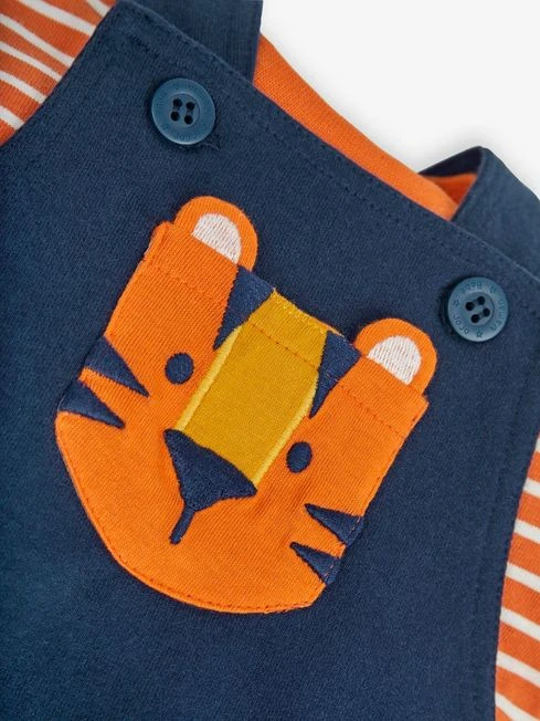 A fun tiger applique creates a handy pocket on the front of this 2Piece Navy Tiger Appliqué Dungarees & Top Set. With a classic navy blue background and a contrast orange stripe top, you can easily assemble your outfit. The set is made from soft cotton, so your baby stays comfortable and cozy all day as they explore the world around them. 2piece set Tiger appliqué pocket to dungarees Popper leg opening for easy changing Button waist and shoulder opening for easy dressing Short sleeved Breton top with popper shoulder opening for easy dressing Please note appliqué stitching may vary.