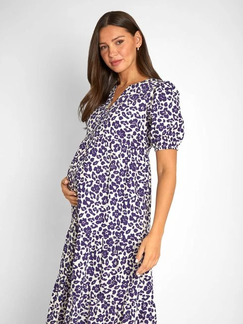 Embrace your maternity style with our Navy Animal Print Tiered Maternity Midi Shirt Dress. With its tiered skirt and tie waist, this classic cream dress features an all-over navy animal print for a stylish and smart look throughout pregnancy. A pair of heels can easily dress it up, or you can wear it with sandals or trainers for a casual summer look. We’re proud to invest in making cotton production more sustainable. Designed to fit throughout pregnancy. All-over animal print. Supersoft fabric. Button down design. V-neck. Waist tie to adjust to your changing shape. Gathered puff sleeve.??