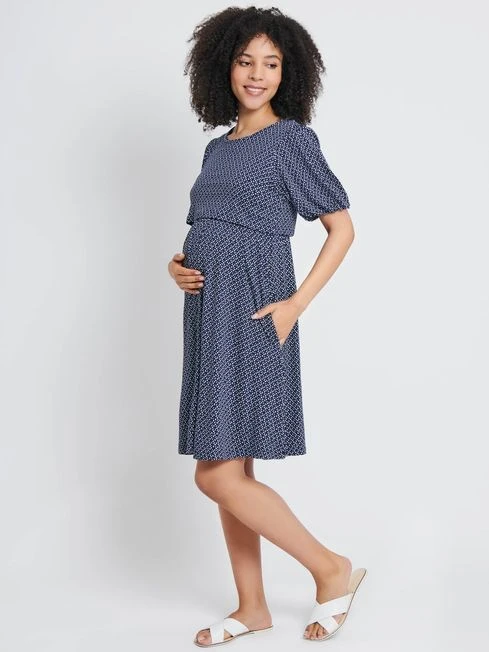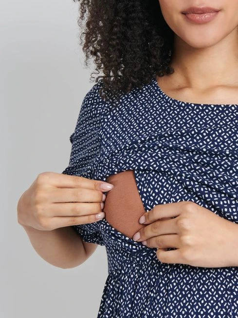 Breastfeed with ease and in style this season with our Navy Batik Print Maternity & Nursing Dress. The overlayer can be pulled up to reveal concealed feeding slits for easy access when you’re out and about. Cut to fit both during and after pregnancy, it allows you a bit of room whilst you’re getting your shape back too. The chic batik print is an easy way to wear patterns, simply change up your accessories to create different looks. Designed to fit during and after pregnancy. Supersoft fabric. All-over batik print. Easy and discreet breastfeeding access. Under layer with feeding slits, Half balloon sleeves. Pull-on style.