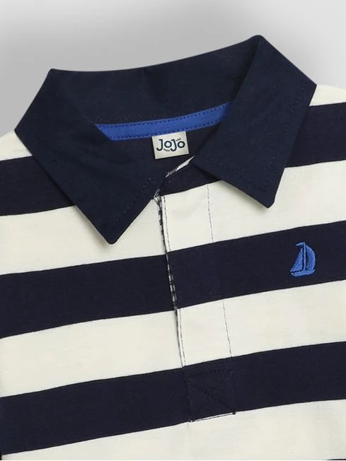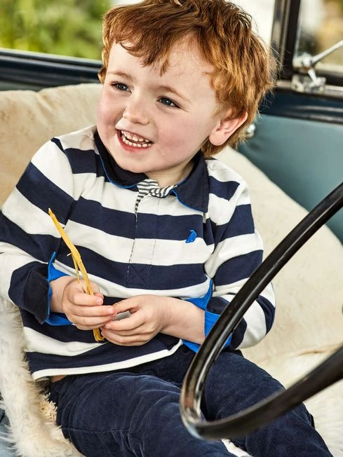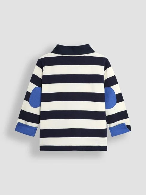 If you’re looking for something a little smarter to add to your child’s wardrobe, our kid’s classic stripe rugby top fits the bill. Chunky stripes and twill elbow patches offer a sporty look that kids will feel comfortable in. Team with trousers or jeans for an easy outfit., chunky navy and ecru stripes, contrast cobalt blue elbow patches and a boat embroidered to the chest. Made of 100% cotton.