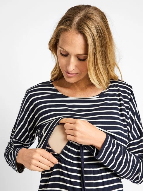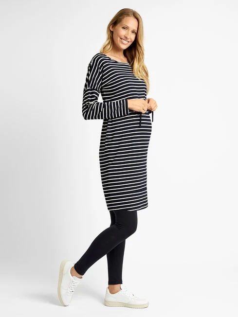 The Navy and Ecru Stripe Maternity and Nursing Drawstring Dress is a stylish and easy-wearing option for pregnancy and after your baby arrives. With a loose-fitting top and slim skirt with a drawcord to adjust the fit, it allows you to define your figure in all the right places. For women who choose to breastfeed, it features concealed feeding slits to offer quick and easy nursing access. Designed to fit during and after pregnancy. Supersoft fabric. Loose-fitting top. Slim-fitting skirt. Concealed feeding slits in under layer for easy and discreet nursing access. Drawcord at waist to flatter your changing shape. Long sleeves. Length 93cm.