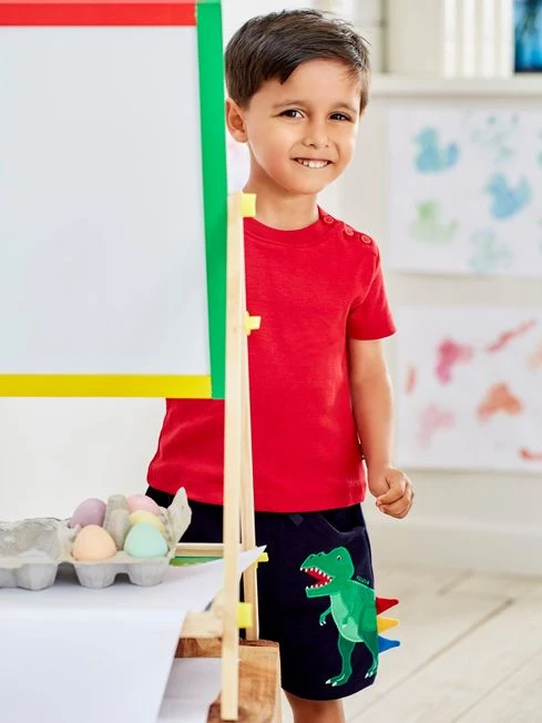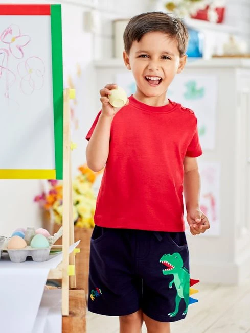 A cosy pair of shorts have had a roar-some update with a dinosaur appliqué and roar embroidered to the legs to delight your dinosaur-loving child. The navy base makes them easy to style with a plain or dinosaur-themed T-Shirt for an outfit that s perfect for active days out in the sun. Plus, we’ve added some 3D T-Rex spikes to one side to make them even more T-riffic! Dinosaur appliqué and roar lettering to legs. 3D dinosaur spikes to the side. Front legs lined in cotton to avoid the irritating delicate skin. Elasticated waistband for stretch and comfort,. Drawstring to the waist for a custom fit. Slip pockets to the side. Please note: appliqué stitching may vary.