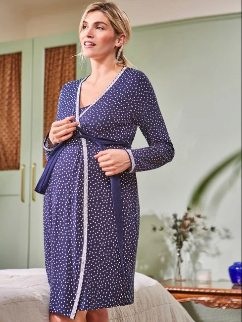 If you’re looking for an easy cover-up whilst you’re at home, the Navy Spot Maternity and Nursing Robe is the solution. Designed to fit throughout your whole pregnancy and also cut to provide easy breastfeeding access, it’s perfect for use after the birth too. It’s also suitable for packing into your hospital bag, and the tie ensures it stays securely fastened. Designed to fit during and after pregnancy. Supersoft fabric. All-over spot print. Crossover style. Lace detail. Belt and loop to secure. 95% Viscose, 5% Elastane. Use delicate setting. Do not tumble dry. Cool iron on reverse. Do not dry clean.