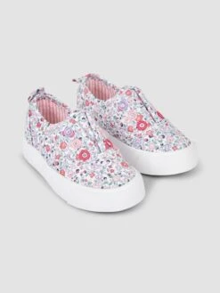 Our Pastel Ditsy Plimsoles are a summer wardrobe must-have. The fun style of these canvas shoes is easy to coordinate with our children s clothing, and their simple design makes them easy for kids to put on. They feature a floral ditsy print in shades of green, purple and pink with a contrast stripe lining. • All-over ditsy print • Cool cotton upper • Grippy rubber sole Upper: 100% Cotton, Sole: Rubber.