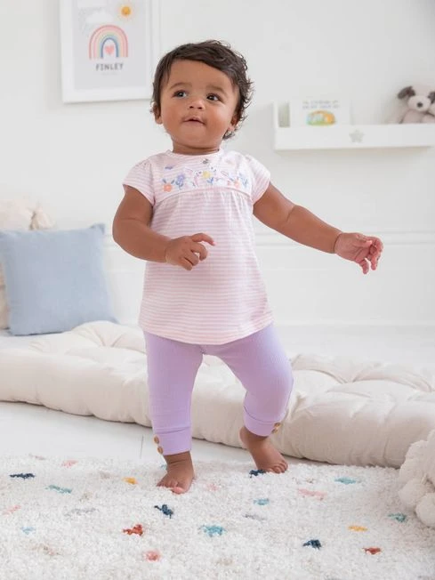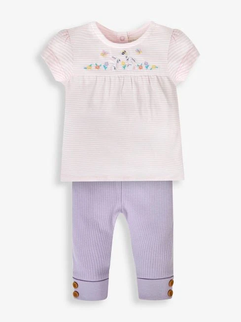 With this fantastic set, getting your baby ready for the day won’t be so hard! The top features puff sleeves and bunny embroidery detailing, and the leggings are made of practical lilac ribbed material. No matter how they’re worn together or separately, they’re sure to look great. 2-piece set. Bunny embroidery on top. Back opening to the top for easy dressing. Short sleeves. Elasticated waist for stretch and comfort.