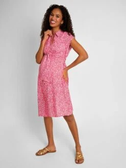 The shirt dress is an easy, flattering style on every shape and during pregnancy, making it a great choice when you need a smart casual look. The Pink Animal Print Maternity Shirt Dress with Tie will appeal to those who like bold tones and are looking for a stylish dress to wear to work or on a day out. No matter what stage of your pregnancy you’re in, the waist tie will help define your shape. Designed to fit throughout pregnancy. All-over floral print. Supersoft fabric. Waist tie to adjust to your changing shape. Button-down design. Classic shirt-style collar. Cap sleeves.