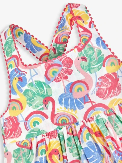Featuring a fun, summery print of green, pink, yellow and blue, this dress makes a great addition to any wardrobe. This Bright Flamingo Print Cross Back Dress can be dressed up or down and is perfect for layering. This cotton dress is both comfortable and durable, making it perfect for everyday wear. All-over flamingo print. Cross back. Square neck. Gathering to empire seam. Sleeveless.