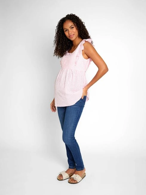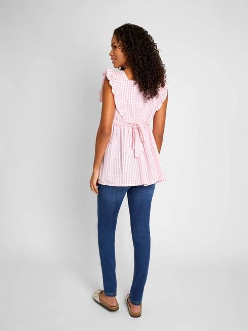 You can add a nice pop of pattern to your maternity wardrobe this season by wearing the Pink Gingham Frill Sleeve Maternity Top with its traditional gingham print. Featuring a square neckline, frill sleeves, and a button-down front, this piece has many subtle yet stylish features that make it an excellent staple. Designed to fit throughout pregnancy. All-over gingham print. Frill sleeves. Square neck. Button front. Waist tie to flatter your changing shape.