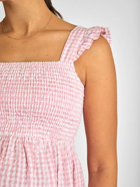 Featuring a traditional gingham print in soft pink and white, the Pink Gingham Shirred Maternity Midi Dress makes the perfect summer outfit. It has a shirred chest, frill straps and a gathered empire seam. The midi length makes it easy to dress up or down for any occasion. Designed to fit throughout pregnancy. All-over gingham print. Shirring to the chest. Sleeveless. Frill to straps. Square neck. Gathering to empire seam.