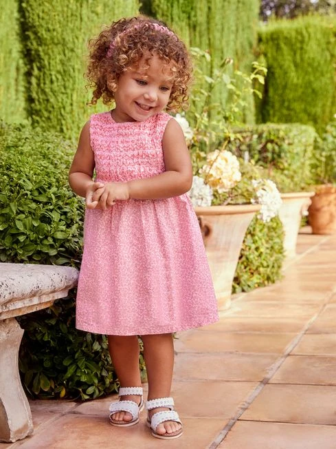 This gorgeous smocked dress will ensure your little one looks the part on every special occasion this season. Available in comfy, soft cotton, it features smocking to the chest with a beautiful all-over floral print. It’s finished with an underskirt that s perfect for twirling in!. All-over floral print. Smocking to chest. Sleeveless. Button back opening for easy dressing. Cotton underskirt. Sizes up to and including 2-3 years come with matching bloomers to use as a nappy cover. 100% Cotton. Machine wash at 40°. Use a delicate setting. Tumble dry on low. Warm iron on reverse. Do not dry clean.