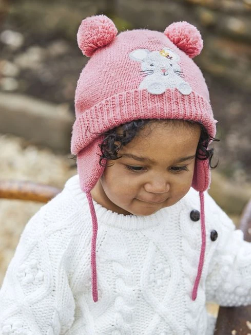 A traditional style gets a modern update thanks to adorable pom poms and mouse appliqué. The pink mouse pom pom hat is crafted from a supersoft wool mix knit with a snuggly fleece lining for extra cosiness. Ears are kept extra warm by little flaps that are secured with a tie under the chin. Features soft wool blend, mouse appliqué to front, fleece lined, pom poms to top, unrestrictive and flexible fit.