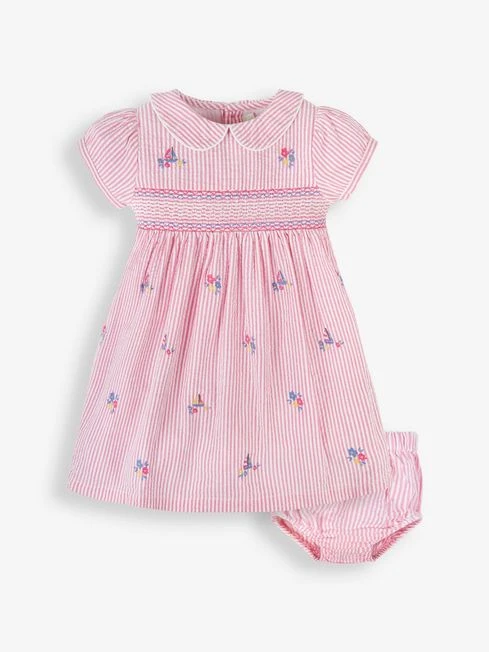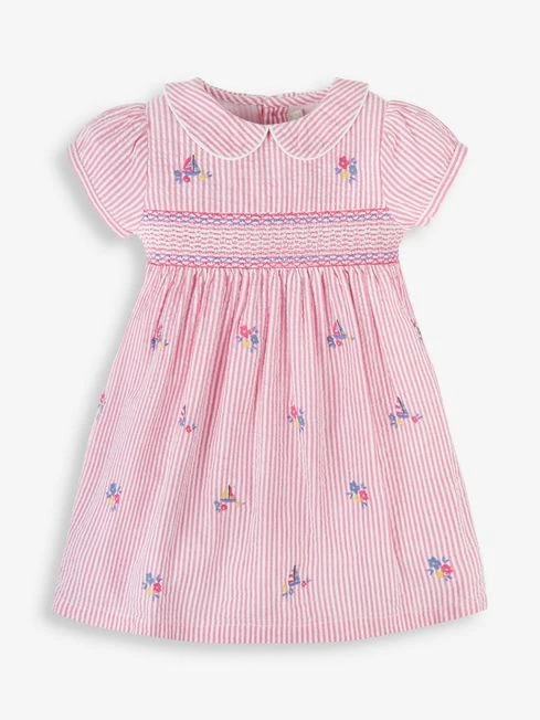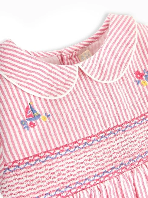 Throughout the spring and summer seasons, this Pink Sail Boat Smocked Dress will ensure your child looks the part at every special event. The dress is made of soft, comfy seersucker cotton with floral smocking on the chest and boat and flower embroidery to the skirt. A cute Peter Pan neckline completes this sweet, smart look. Seersucker stripe. fabric Smocked detailing with embroidery to skirt. Gathers at waist. Cap sleeves. Button back opening for easy dressing. Easy care seersucker looks just as good without being ironed, ideal for holidays and fuss-free dressing. Sizes up to and including 23 years come with knickers to use as a nappy cover.