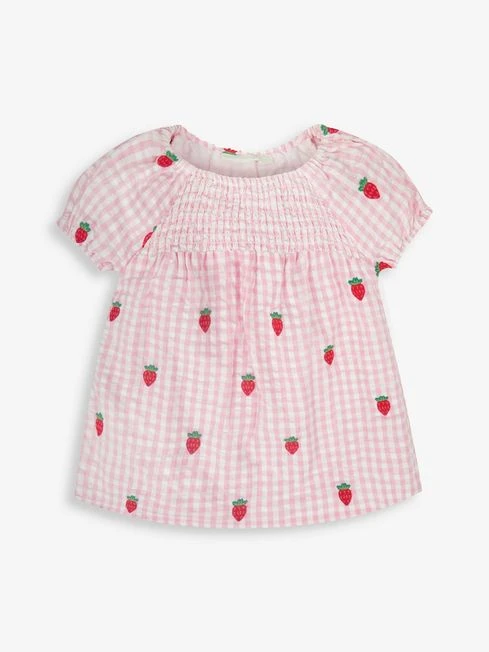 Featuring a strawberry print in pretty pink and white tones, our much loved smocked top has a new look for summer. It is made from the same soft and comfortable cotton with the same smocking detail on the front. Wear it with shorts or leggings for a casual look, while with a skirt and sandals you can dress it up. • Classic gingham • All-over strawberry print • Smocking to front • Elasticated neck and cuffs