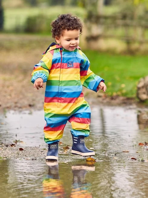 The Waterproof All-in-One has been a JoJo bestseller for years, which is why we’ve introduced this fabulous rainbow stripe version that’s guaranteed to delight toddler boys and girls. Just as practical as the original and designed to keep little ones dry, it offers an extra cute take on the style. A perfect, practical way to bring a little fun to every day if your child loves to play dress-up! • 2 long front zips for easy dressing • Bonded seams • Stirrups • Hood • Reflective elements to arms • Cotton lined.
