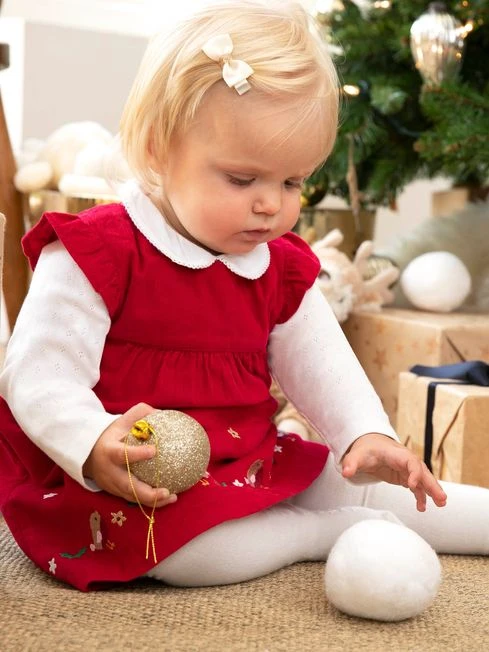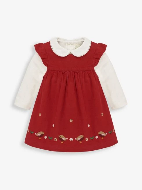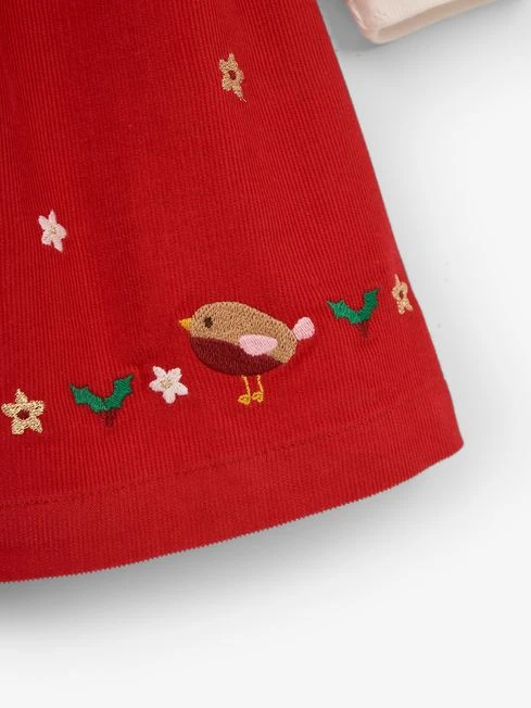 Dress your little one in this gorgeous Red Robin baby dress and body set. In addition to the delicate robin embroidery, this design also features tones of green and gold on a red cord, adding a festive splash of colour on colder days. Finish the look by layering the dress over the included pointelle bodysuit. Features a two-piece set includes bodysuit and cord dress, soft cotton corduroy dress, Robin embroidery, frill sleeves, round neck, and button back openings on the dress and popper back on the bodysuit.