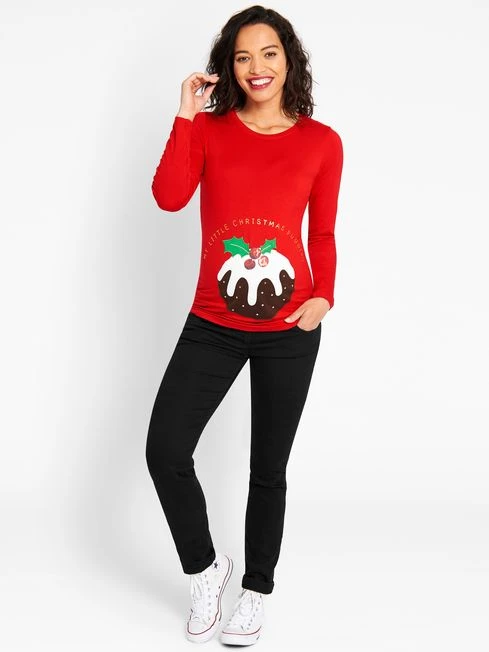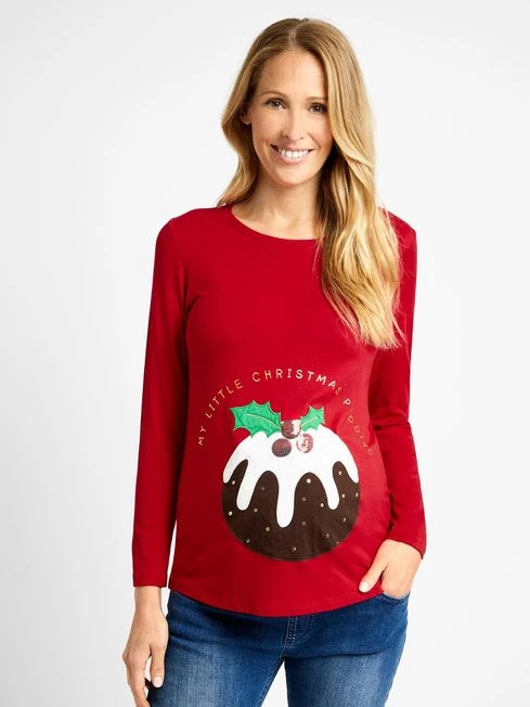 Even your bump can get in on the action this festive season with the Christmas Pudding maternity top. The fun design is an easy addition to your casual wardrobe, perfect for teaming with your favourite jeans. It keeps your look chic and understated. Designed to fit throughout pregnancy. Supersoft fabric. Christmas pudding applique. My little Christmas pudding slogan. Round neck. Long sleeves.