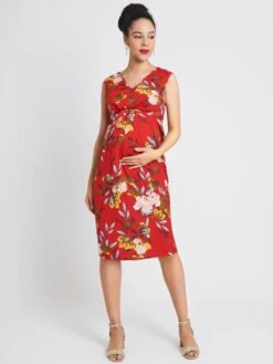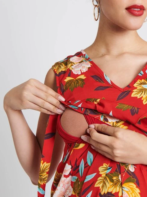 Add some colour and a splash of style to your maternity wardrobe with the Red Oriental Print Maternity & Nursing Dress. The Oriental floral pattern is guaranteed to brighten up your day, and offers a brilliant summerperfect way to bold colour. The relaxed fit and soft fabric will keep you cool and comfortable on hot summer days. The waist tie can be used to define your figure at every stage of your pregnancy, and concealed feeding slits make it easy to breastfeed onthego. Designed to fit during and after pregnancy. Allover floral print. Easy breastfeeding access. Top panel reveals hidden feeding slits. Waist tie to flatter your changing shape. Sleeveless. V-neck. Do not tumble dry. Cool iron on reverse. Do not dry clean.
