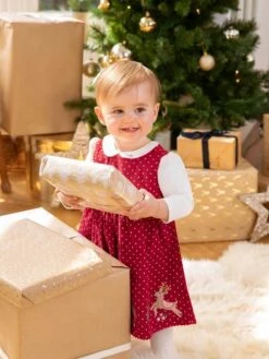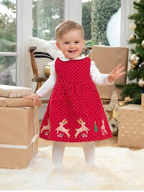 Getting dressed up for the festive season is made easy thanks to the red reindeer appliqué cord dress. Made from soft yet hardwearing cotton corduroy, it’s designed to be cosy and gentle on delicate skin, while gorgeous details like the pretty picot trim, reindeer appliqués prancing along the hem and embroidery ensure the piece is special enough for any Christmas event. Features a soft cotton corduroy, an all-over spot print, reindeer appliqués to hem, flower button detail on outside leg hem, and no baggy knees. 100% Cotton. Machine wash at 40°. Use delicate setting. Tumble dry on low. Warm iron on reverse. Do not dry clean.